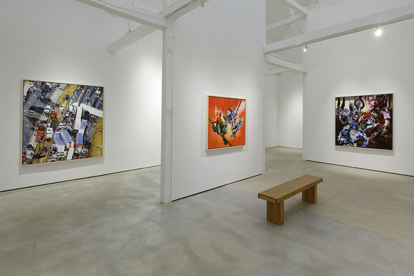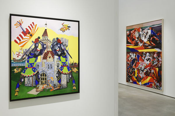 In his last series, Morley presented vibrant, often anachronistic scenes of medieval knights engaged in battle. In Medieval Divided Self (2016), which features a World War I biplane alongside a 16th-century Spanish galleon, symbols from different historical periods collide. In these latest paintings, Morley continued his thirty-year tradition of using models as his source material, forging unexpected relationships between often-incongruous objects.