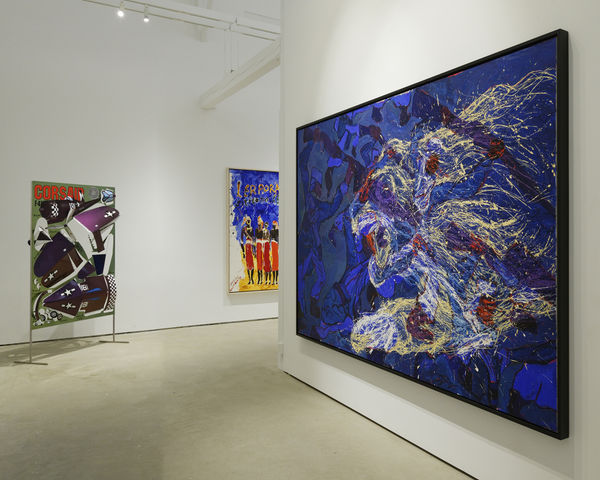 Morley’s use of wide-ranging source material to produce compositions with complex effects of flatness and depth informs his work across the decades. In the 1980s, loose, colorful and energetic paint handling often depicts exotic animals, birds and fish. In French Foreign Legionnaires Being Eaten by a Lion in the Sahara Desert (1986), the soldiers’ dark, flattened forms recede behind the vigorous, bright paint splatters of the charging lion.